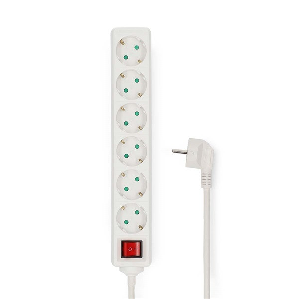 Ez a fehér színű hálózati elosztó, biztonsági kapcsolóval és 6db 45 fokos elrendezésű földelt aljzattal rendelkezik.